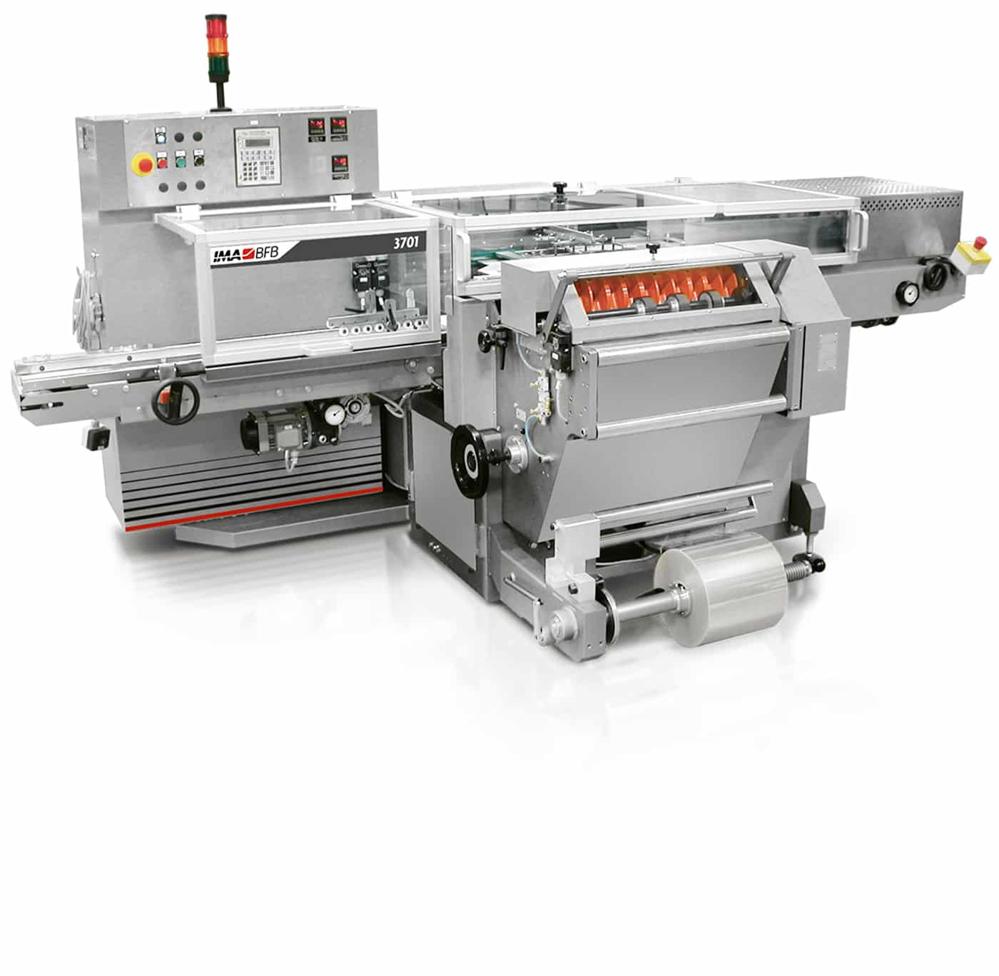 Complete with a device to lift the film-driving rollers during product elevation, these machines enable the use of extremely thin films and avoid the film sliding around the product, thus obtaining the perfect over wrapping finish.