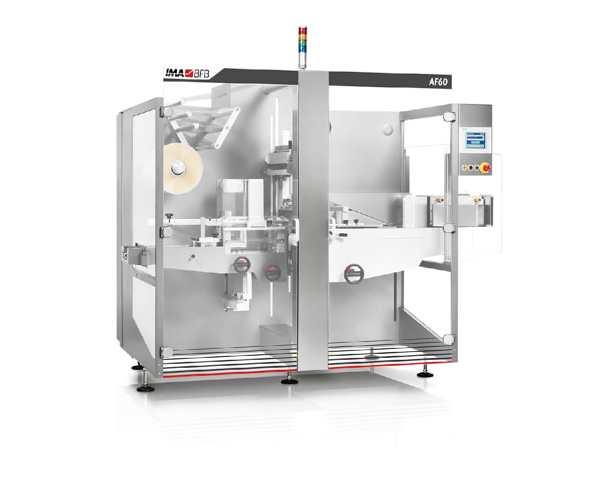 Ideal for pharmaceutical products, equipped with a high-speed stacking unit capable of stacking up to 225 layers/min., the AF60 can also be set up with a carton tilting unit (AF60AM) capable of standing on edge as many as 400 cartons/min.
