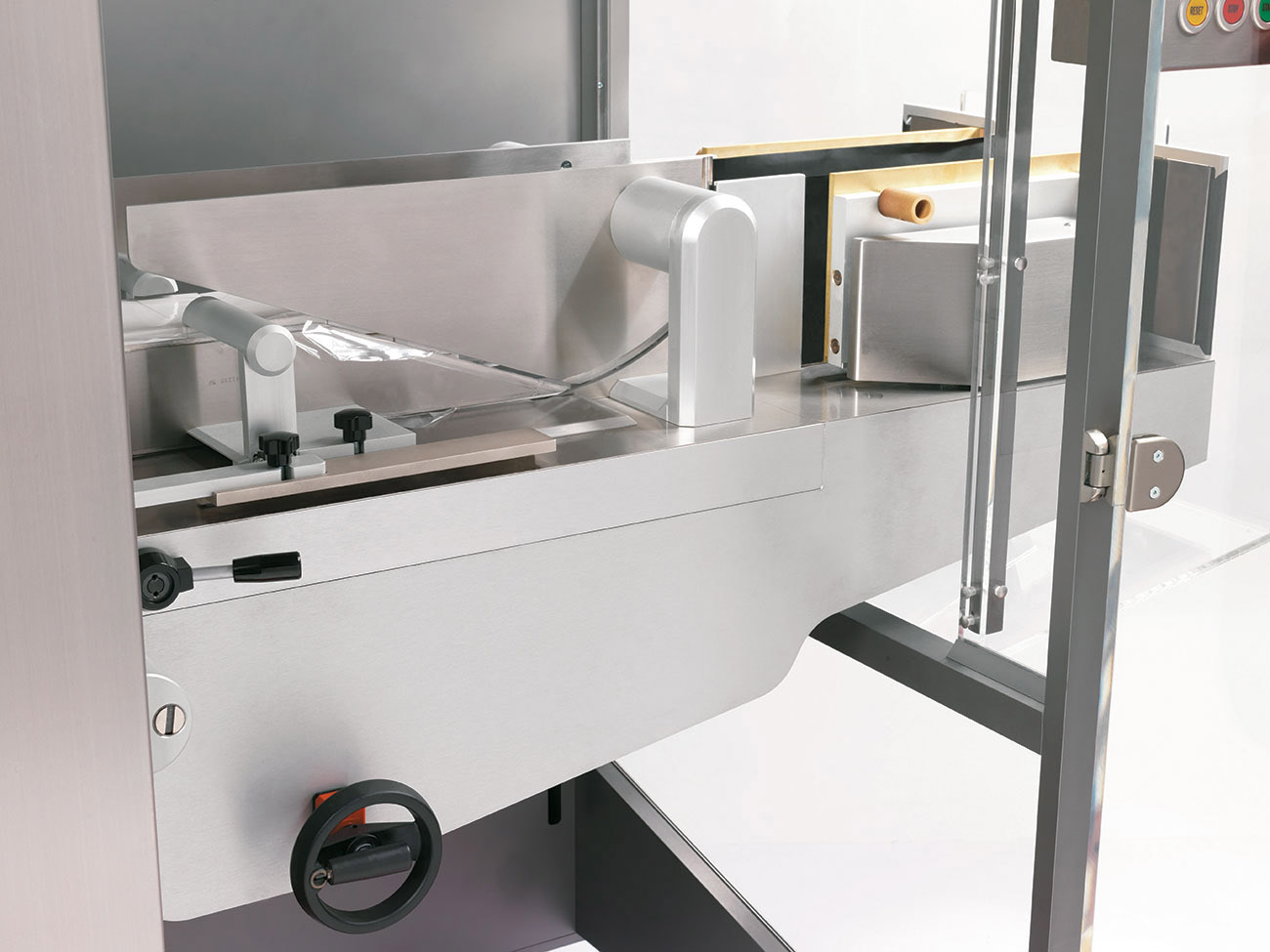 The machine’s main standard features include a scissor knife, film transport by pincers, transversal edge-sealing, driven movement of bottom and lateral film folders, and reciprocating lateral sealing plates.