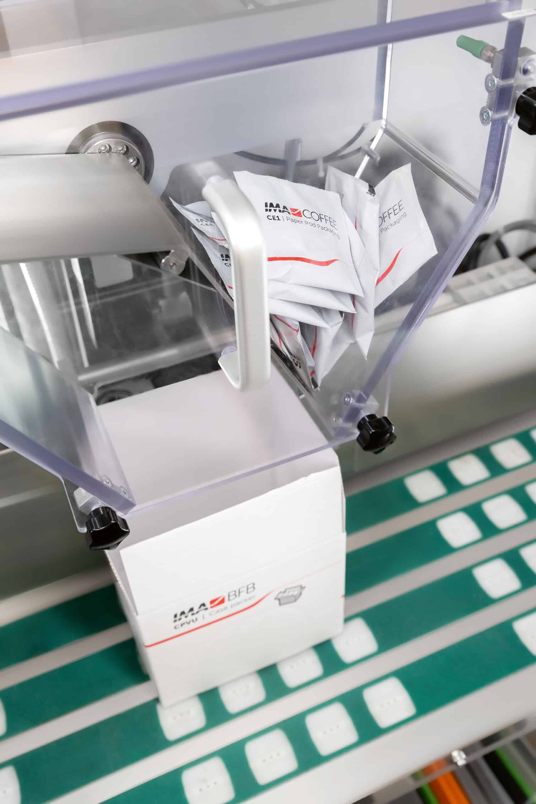 The high-speed vertical case packer for coffee pods and capsules in envelopes and flowpacks.