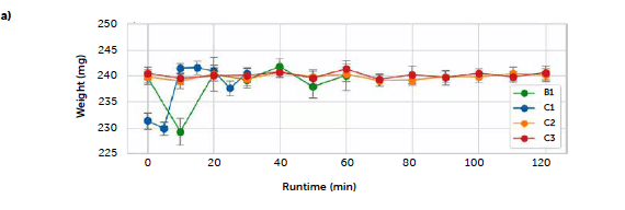 A decrease in the feeding rate of the lubricant is consistent with the increase in the percentage of the API observed in the tablets for the C2 run. On the other hand, the C3 run presented a more controlled feeding profile and resulted in a steadier tablet concentration. The refill operation is probably the most delicate phase of continuous feeding, and the magnesium stearate is an ingredient that requires particular attention during this operation, being characterized by very low flowability and a tendency to form bridges and aggregates. It needs to be poured slowly to aerate the powder and avoid packing. During this experiment, the operation was carried out manually and, therefore, subject to a certain degree of variability. The two profiles reflect how an optimization of this phase of the process can impact and can be observed in the final product.