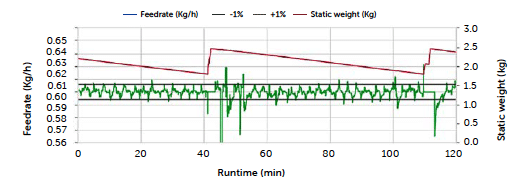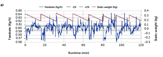 of the feeder rate outside the control region during the entire run, especially compared to the profile of the C3 run. The dark red line on the plot represents the weight of the product inside the hopper and allows one to follow the refill operation, corresponding to the sharp increase in weight. For the C2 run, larger deviations of the feed rate are recorded immediately after the refill operations and appear more intense in the second hour of production.