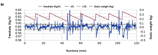 Figure 2: Magnesium stearate feeding rate along the runs C2 (a) and C3 (b).