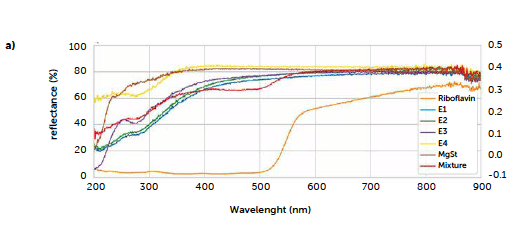 In order to use reflectance spectroscopy for a direct quantification of riboflavin in the solid tablets, the first issue to be solved was to identify a characteristic signal of riboflavin, with the aim of using its area for a univariate analysis. Therefore, spectra of each ingredient in powder form were acquired as described in section 2.3.2. The obtained spectra are reported in Figure 4a, where a drop of the riboflavin UV-reflectance curve (orange line) can be observed around 580 nm. Such a drop is absent on the excipient profiles, therefore, it can be considered characteristic of riboflavin. In Figure 4a the spectrum of the 2% mixture is also reported (red line), presenting an analogous signal at 580 nm.