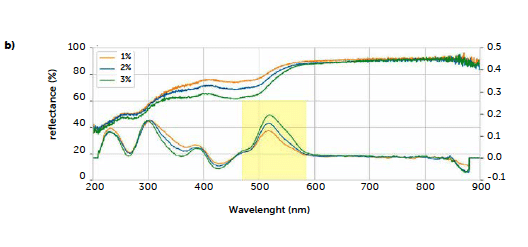 Based on these preliminary tests, the spectra of tablets at different riboflavin concentrations were acquired. Figure 4b shows the characteristic signal of riboflavin, previously identified, which changes according to analyte concentration: orange, blue, and green curves in the upper plot represent the three riboflavin concentrations (1 %, 2 %, and 3 %ω/ω respectively), and their slopes increase in agreement with riboflavin concentration, corresponding to higher absorption of radiation. The Savitzky-Golay first derivative of the reflectance spectra, shown in the lower part of Figure 4b, converts the drop into a characteristic peak of the analyte, whose area increases with concentration. This result allowed for the calculation of a univariate quantitative model, using the areas as the response.