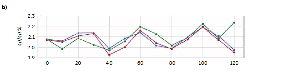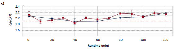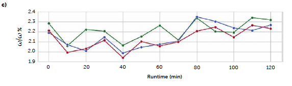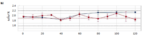 The continuous trials appear closer to the target concentration compared to the batch reference test, with lower mean values of all samplings except for the last sample of the C3 run (red line) and the second hour of the first long trial C2 (orange line), that reported an increase in concentration after 60 minutes of production, kept constant until the end. An explanation of these irregularities can be found in the data of the dosing operation. Figure 2 reports the feeding rate of the feeder LIW3, containing the lubricant MgSt, during trials C2 (a) and C3 (b) respectively. The deviation from the target dosing rate is considered acceptable for this test. The C2 run shows an important fluctuation