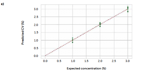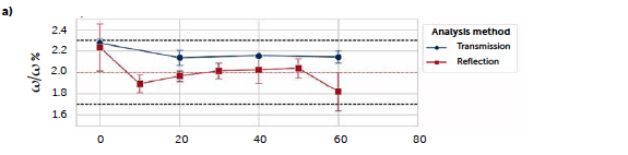 Figure 6: comparison of the predicted riboflavin concentrations from the two univariate UV–Vis methods: transmittance (blue solid line) and reflectance (red solid line). Results are reported along the three processes B1 (a), C2 (b), and C3 (c). Dashed lines represent the target concentration (red) and the ± 15 % limit (black).