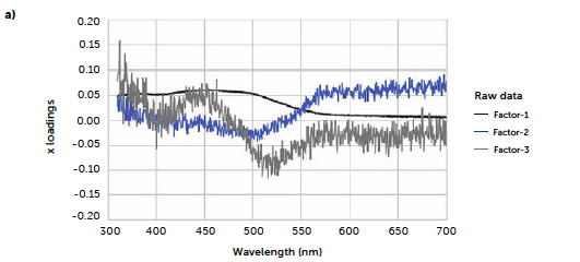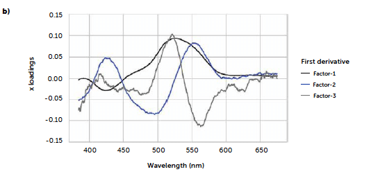 Figure 8: comparison between PLS models carried out with original UV–Vis reflectance spectra (left portion) and spectra pre-treated with Savitzky-Golay 1st derivative (right portion). Loadings plots (a and b) and parity plots (c and d) are reported.