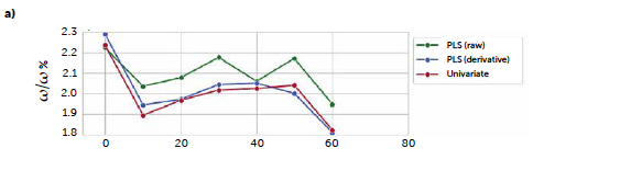 Since, in this case, the spectra presented a sharp signal of the analyte, we expected a good accordance between the PLS and the univariate prediction, and the trends of the mean values confirm a good agreement between the univariate and the PLS results from the derived spectra, with only a significant difference for the samplings between 80 and 100 minutes in C3 run. The untreated spectra model, instead, shows a more variable trend compatible with a greater presence of noise, as observed in the loadings plot. 4.