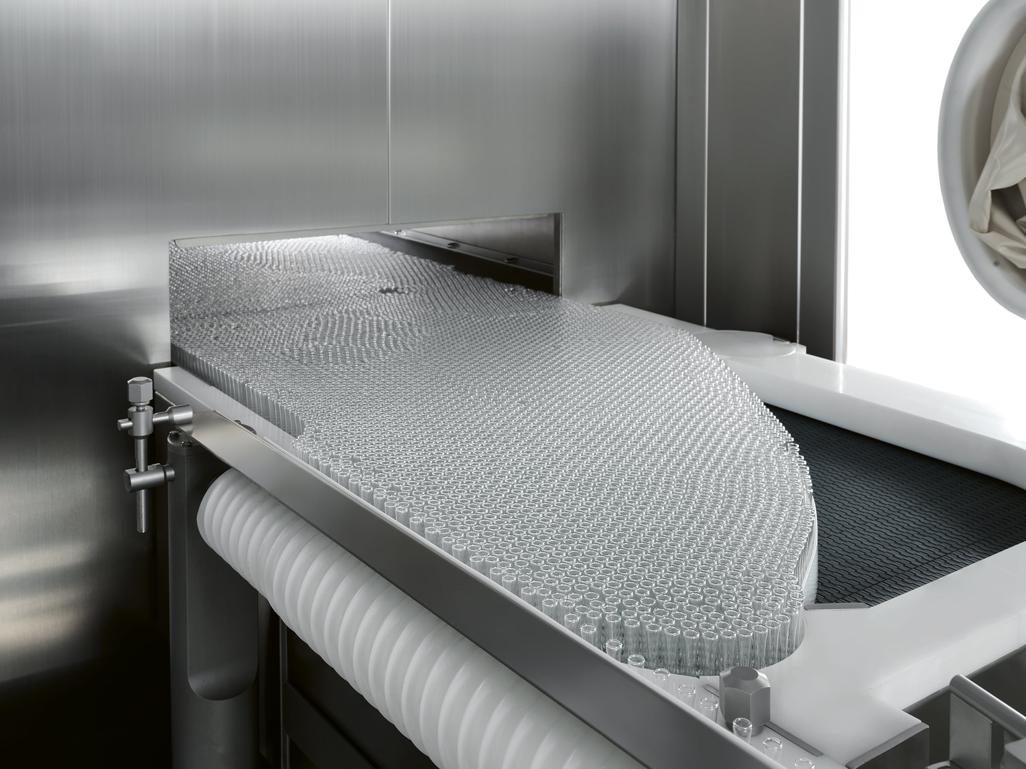 The machine is designed with three laminar flow zones: infeed, heating and cooling. Each zone complies with the ISO 14644-1 and 14644-2 regulation and is separated by means of motorized gates which are opened and automatically closed according to the production flow.