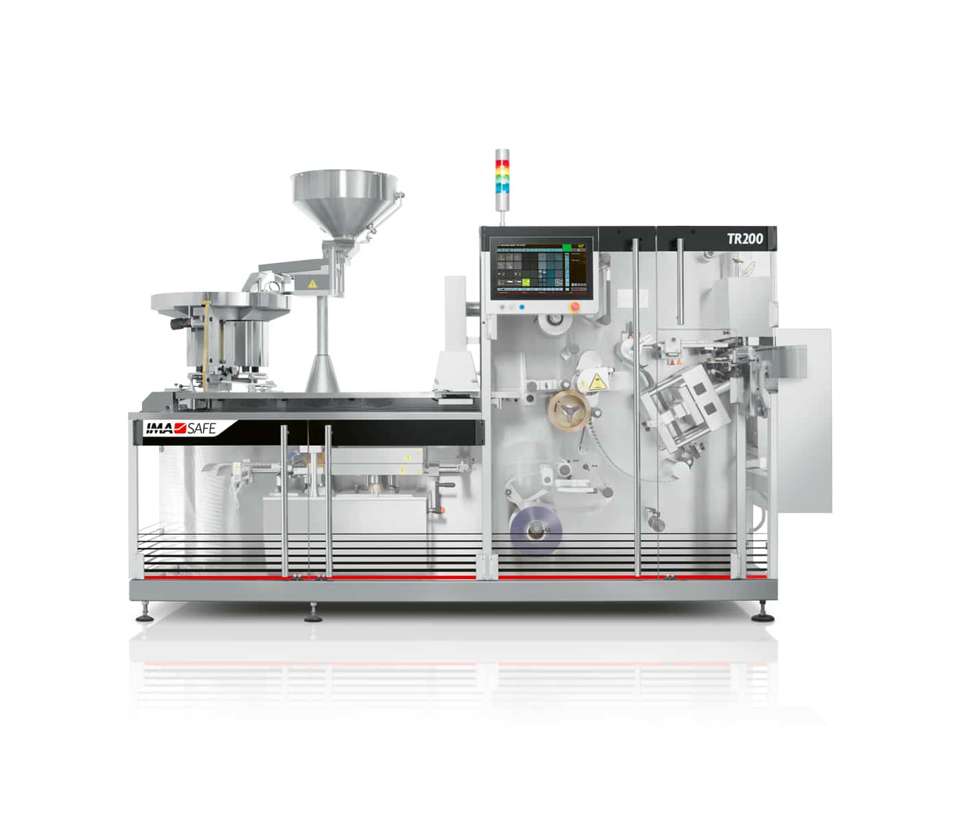 TR200 is a double-row blister packaging machine able to reach 350 blisters/minute. The machine is based on established technology which guarantees an excellent production reliability together with quick and easy size changeover.