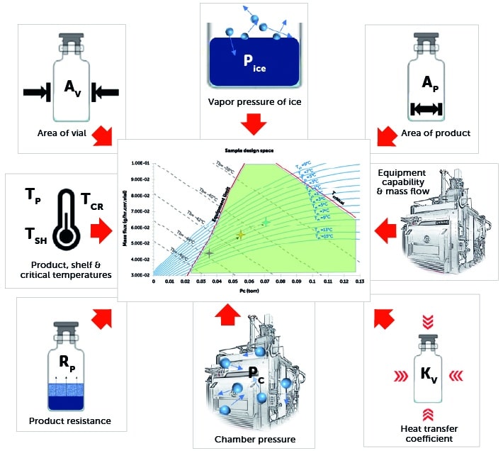 A design space is a graphical representation of various process parameters that influence the primary drying of a product, displaying regions that allow for efficient drying while staying within the bounds of the process. A design space is generally constructed as part of a quality by design (*QbD) cycle development project, supporting a first-principles-based and scientifically justified approach to cycle development and modification.