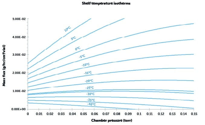 • At a range of shelf temperatures and chamber pressures, the values of product temperature at the bottom of the vial are calculated.