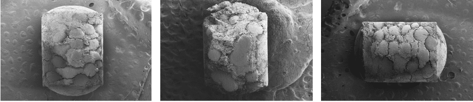 Figure 3: SEM of minitablets MT1 compressed from EC pellets and excipients: complete minitablet (left, middle) and section (right).