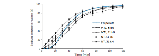 The sodium benzoate release profiles from MT1, 11 kN and NT, 31 kN are similar (difference factor 11, Table 7).