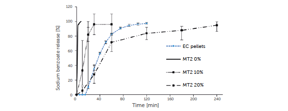 The different thickness and the condition of the ethylcellulose layers result in significant deviations in the release plots. Otherwise, the similarity factors meet the acceptable range of 50–100, hinting to the weaker evaluation of this parameter. The high coating level of EC pellets (44.4%) with a high specific surface area corresponds more obviously to the higher-coated MT2 20% (similarity factor 68) than to MT2 10% (similarity factor of 58).