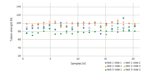 Figure 2: tablet strength variation of test 1, test 2 and test 3 in Prexima 800.