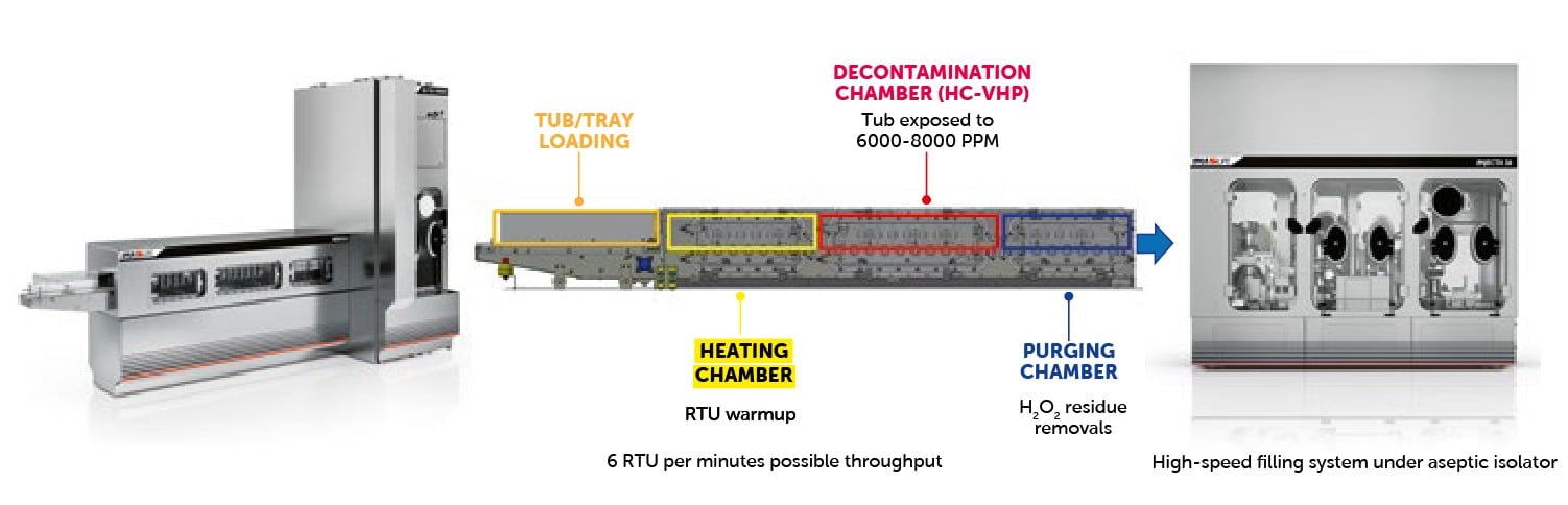 • Continuous operation: The tunnel design enables continuous decontamination of multiple containers simultaneously, with up to 5/6 tubs/trays entering the aseptic area per minute, significantly increasing throughput and efficiency versus current traditional VPHP methods.
