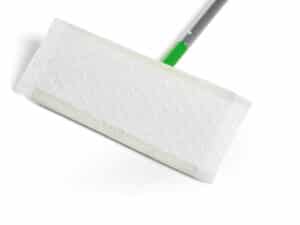 The machine combines an high absorbency core contained within two layers of nonwoven, welded and folded over: result is an extremely effective mop, using the minimum amount of material. Layers are solidly bonded together through ultrasonic welding avoiding the use of glue, which would make the product extremely strong.