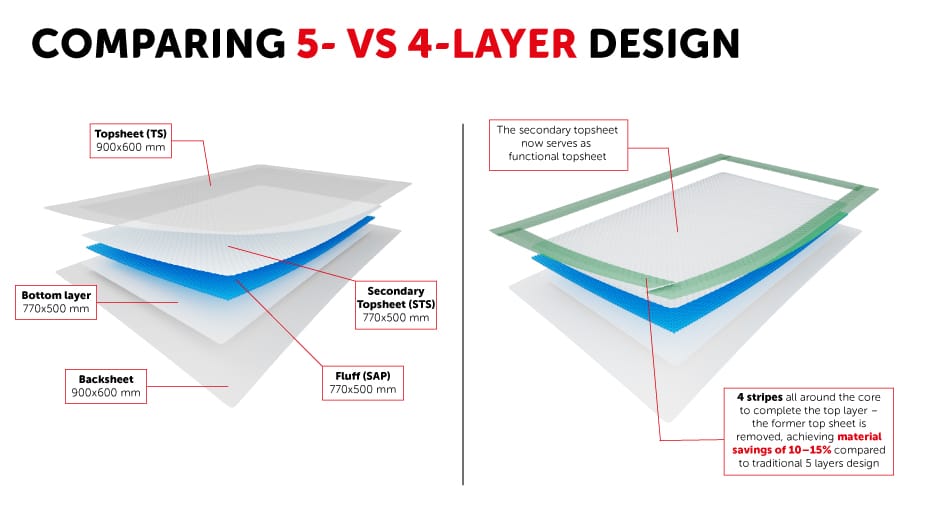 The new design allows to save an entire layer (the former real topsheet which is now removed), achieving direct material savings of 10–15% compared to traditional 5 layers design. The result is dramatic material efficiency (absorbent pads up to 31% lighter than average) without compromising absorbency or fluid distribution.